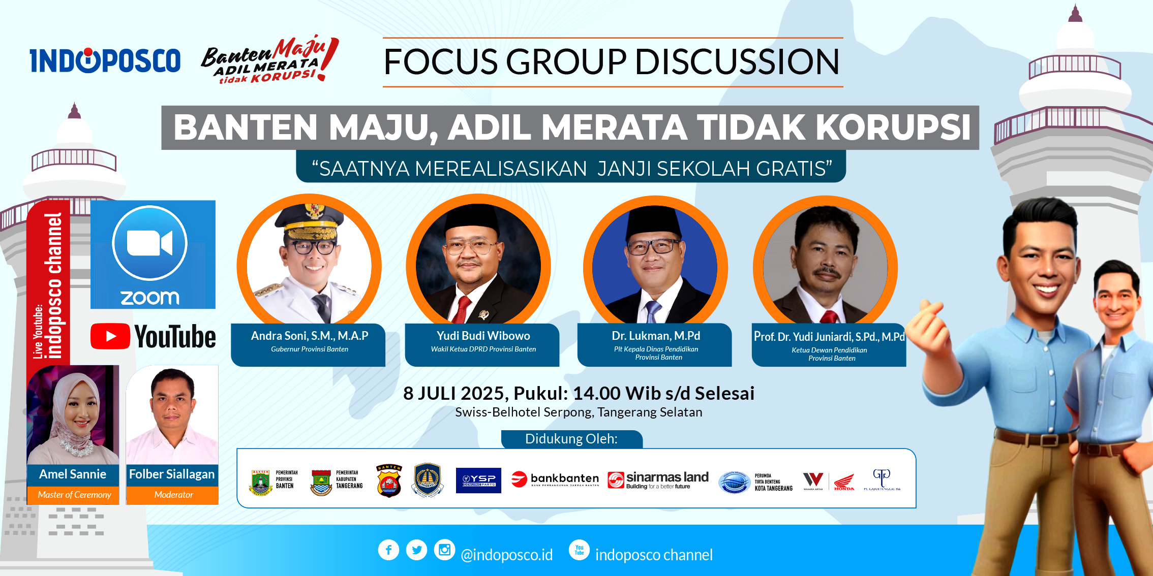 INDOPOSCO.ID – Live Streaming FGD INDOPOSCO dengan tema: ” Banten Maju Adil Merata Tidak Korupsi: Saatnya Merealisasikan Janji Sekolah Gratis”