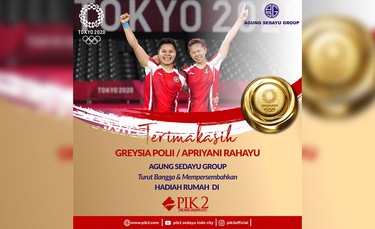 “Kami bangga dan terharu atas keberhasilan srikandi Indonesia, Greysia Poli dan Apriyani Rahayu. Besar harapan kami hadiah rumah tinggal di PIK2 bagi kedua putri terbaik bangsa ini bisa menyemangati untuk terus berprestasi,” kata CEO Agung Sedayu Group, Steven Kusumo dalam keterangan resminya di Jakarta, Selasa (3/8).