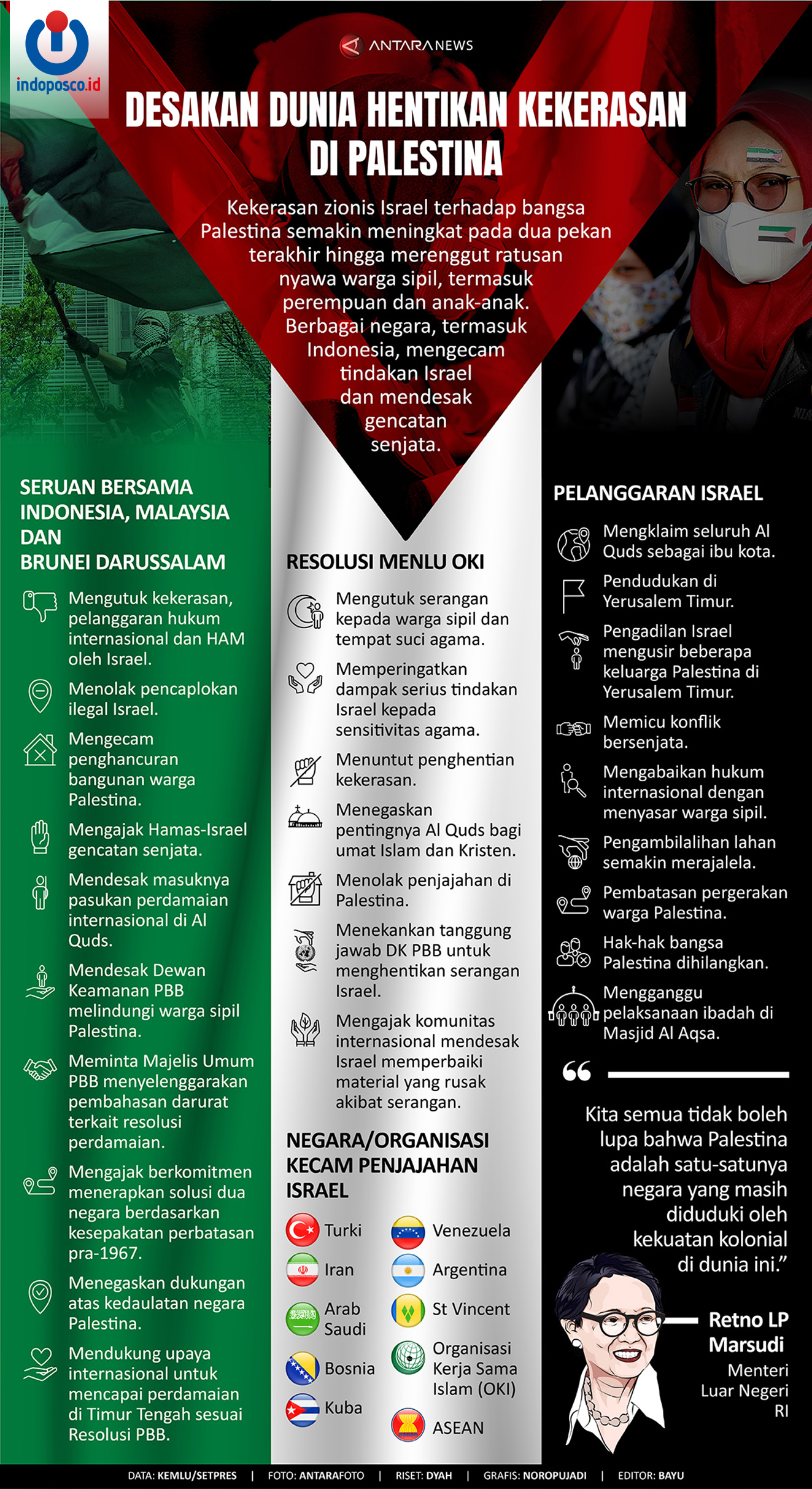 INDOPOSCO.ID – Kekerasan zionis Israel terhadap bangsa Palestina semakin meningkat pada dua pekan terakhir hingga merenggut ratusan nyawa warga sipil, termasuk perempuan dan anak-anak. Dilansir dari Antara, berbagai negara, termasuk Indonesia, mengecam tindakan Israel dan mendesak gencatan senjata. (gim)