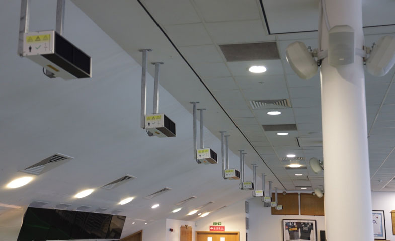 Ketinggian dimana luminer ini dipasang, dalam kombinasi dengan desain luminer, memungkinkan sistem ini untuk mendesinfeksi udara yang bersirkulasi di dalam ruangan, bahkan saat ada orang di dalamnya.