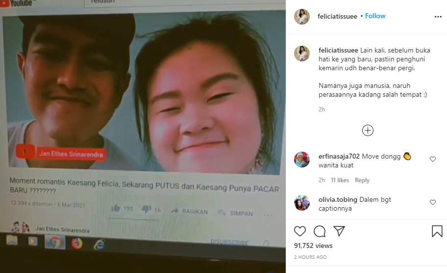 “Lain kali, sebelum buka hati ke yang baru, pastiin penghuni kemarin udh benar-benar pergi. Namanya juga manusia, naruh perasaannya kadang salah tempat :)” tulis Felicia dalam keterangan video yang diunggah di akun Instagramnya, Minggu (7/3/2021).