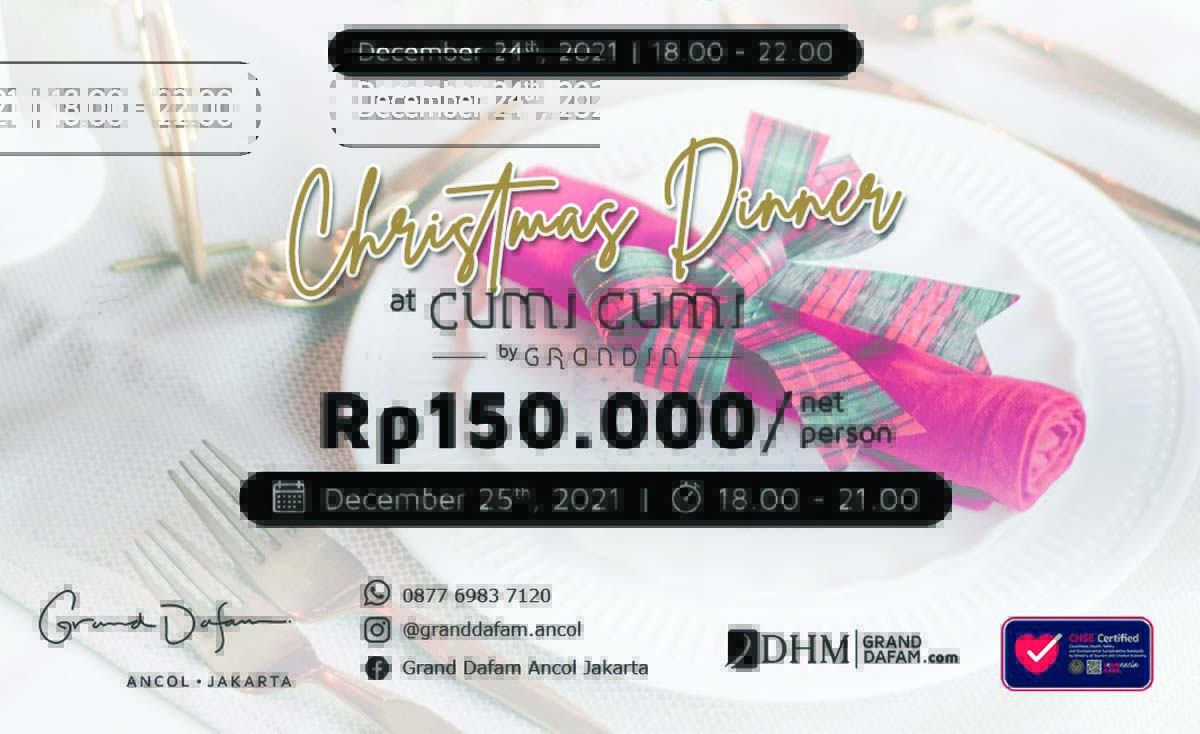 33 Skybridge yang terletak di lantai 33 Grand Dafam Ancol Jakarta mengadakan Christmas Eve BBQ yang akan dimulai dari jam 5 sore sampai jam 10 malam dengan harga Rp149.999net per orang. Sedangkan bagi para keluarga yang ingin mencoba Christmas Dinner ala Pasar Senggol dapat langsung mampir ke Cumi Cumi Restaurant by Grandin yang terletak di Lobby hotel. Dengan harga Rp150.000net para tamu dapat menikmati hidangan malam yang beragam dan diringi live music sepanjang malam.