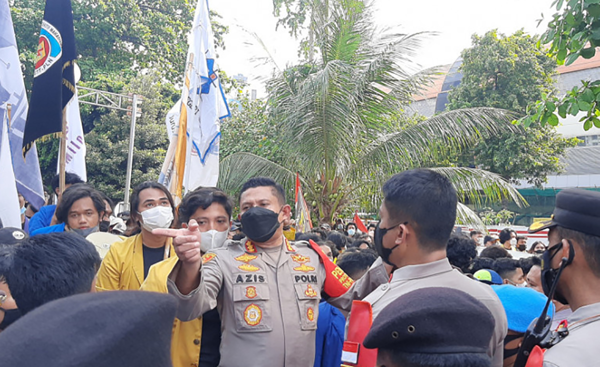 Kapolres Metro Jakarta Selatan (Jaksel) Kombes Pol Azis Andriansyah, yang berada di lokasi demo, mengimbau massa untuk tetap tenang dan tidak melakukan tindakan anarkis, dan meminta menjalankan aksinya secara damai.