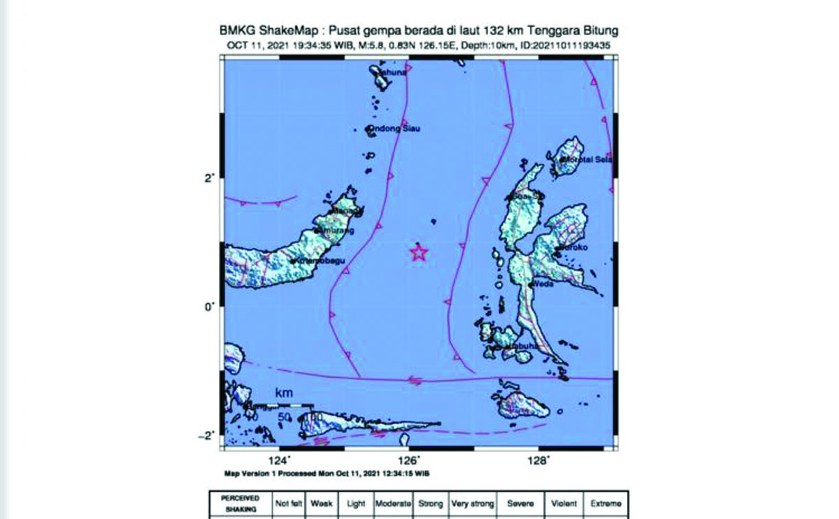 INDOPOSCO.ID – Badan Meteorologi, Klimatologi dan Geofisika (BMKG) menginformasikan gempa yang mengguncang Bitung, Sulawesi utara dengan kekuatan magnitudo (M) 5,7 pada Senin (11/10/2021) malam pukul 19.34 WIB merupakan jenis dangkal akibat aktivitas lempeng Laut Maluku.