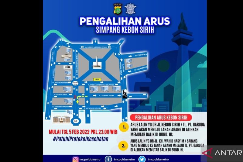 Selain itu, anggota Ditlantas Polda Metro Jaya juga mengalihkan arus kendaraan di sekitar Jalan Kebon Sirih Jakarta Pusat akibat pembangunan infrastruktur MRT Jakarta fase dua mulai Sabtu pukul 23.00 WIB. “Berlaku one way dari arah Abdul Muis menuju Kebon Sirih,” ujar Sambodo dikutip Antara.