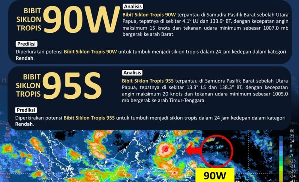 INDOPOSCO.ID – Badan Meteorologi, Klimatologi dan Geofisika (BMKG) memantau adanya dua bibit siklon tropis di wilayah timur Indonesia yang dapat berdampak pada kondisi cuaca di sejumlah wilayah.