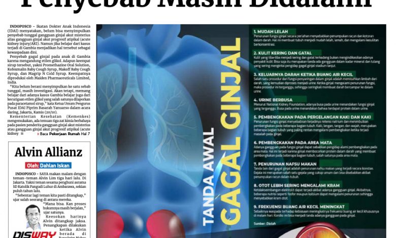 KORAN INDOPOSCO – Ikatan Dokter Anak Indonesia (IDAI) menyatakan, belum bisa menyimpulkan penyebab tunggal gangguan ginjal akut misterius alias gangguan ginjal akut progresif atipikal (acute kidney injury/AKI). Namun jika belajar dari kasus terjadi di Gambia menjadikan hal tersebut sebagai kewaspadaan dini.