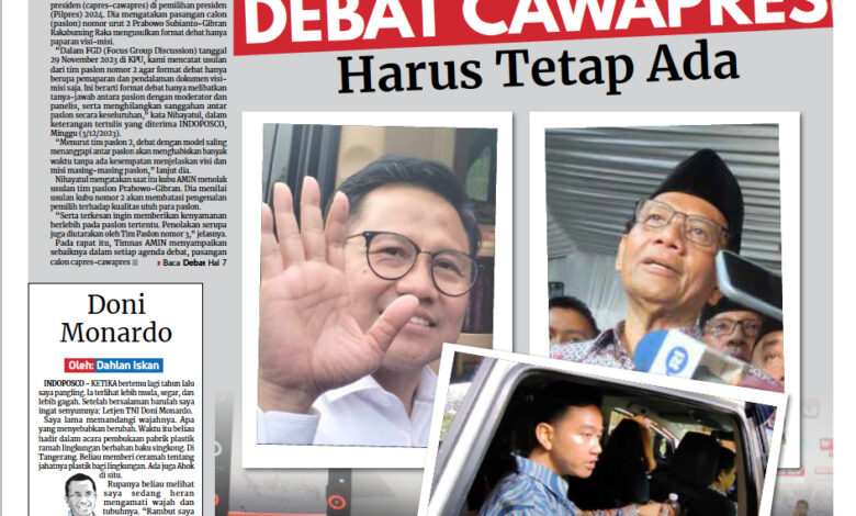 KORAN INDOPOSCO – Co-Kapten Tim Nasional Anies Baswedan-Muhaimin Iskandar (Timnas AMIN) Nihayatul Wafiroh membeberkan isi rapat bersama Komisi Pemilihan Umum Republik Indonesia (KPU RI) soal usulan format debat calon presiden-calon wakil presiden (capres-cawapres) di pemilihan presiden (Pilpres) 2024. Dia mengatakan pasangan calon (paslon) nomor urut 2 Prabowo Subianto-Gibran Rakabuming Raka mengusulkan format debat hanya paparan visi-misi.