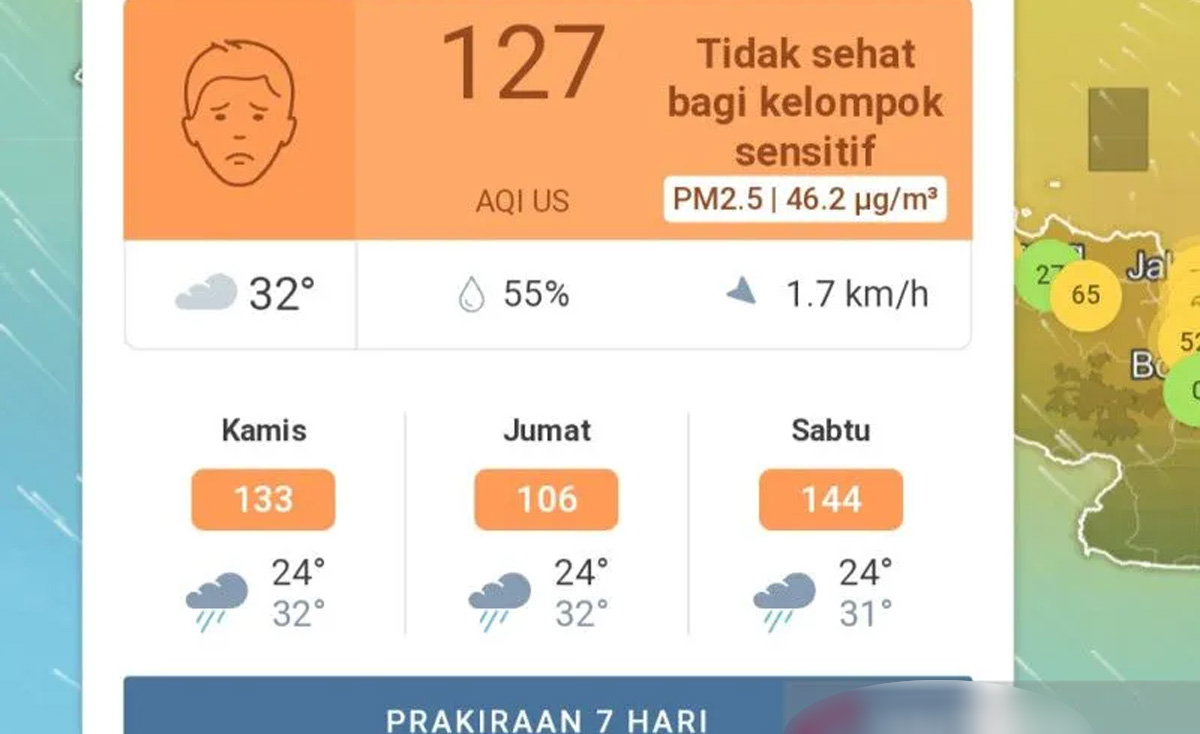 Kualitas udara di Jakarta mencapai AQI US 127 dengan tingkat konsentrasi PM2.5 Jakarta saat ini pada level 46,2 µg/m³.