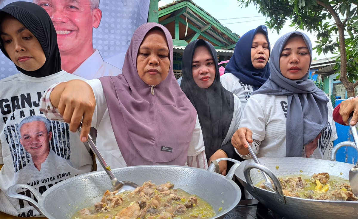 INDOPOSCO.ID – Sejumlah ibu-ibu terlihat bersemangat dalam perlombaan memasak yang digelar sukarelawan Ganjar untuk Semua di lingkungan RW 01, Kelurahan Pasir Jaya, Kecamatan Jatiuwung, Kota Tangerang, Banten, Minggu (19/11/2023).