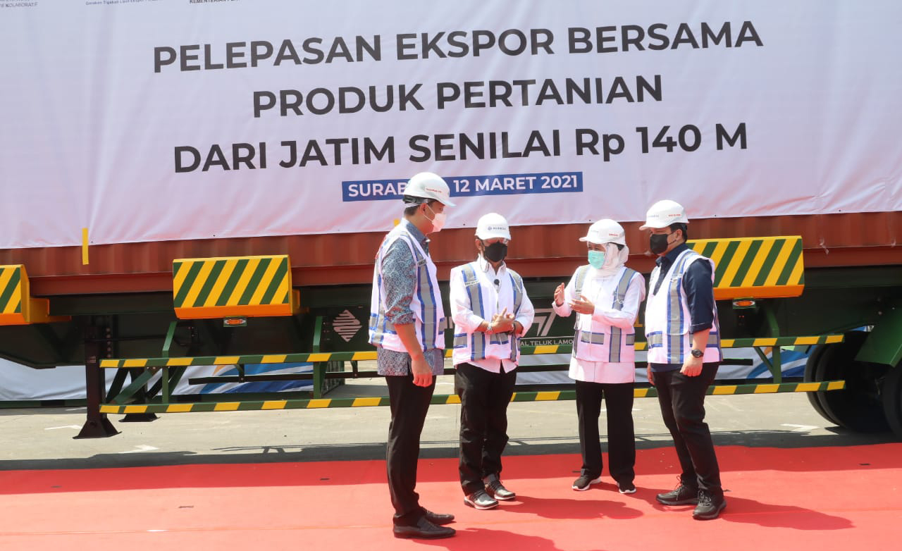INDOPOSCO.ID – Pemerintah Indonesia melepas ekspor produk pertanian asal Jawa Timur (Jatim) senilai Rp140 miliar. Kegiatan itu dilakukan trio menteri antara Menteri Pertanian (Mentan) Syahrul Yasin Limpo (SYL), Menteri Perdagangan (Mendag) Muhammad Lutfi dan Menteri Badan Usaha Milik Negara (BUMN) Erick Thohir (ET). Turut hadir pula mendampingi Gubernur Jawa Timur (Jatim) Khofifah Indar Parawansa.
