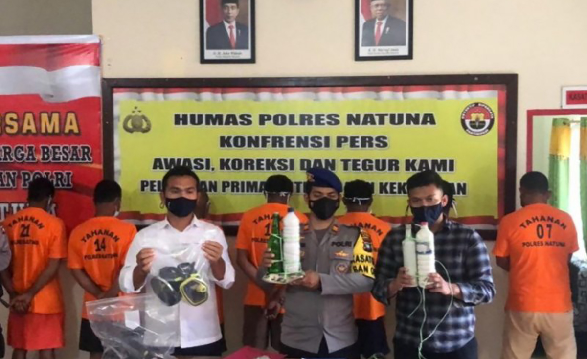 INDOPOSCO.ID – Polres Kabupaten Natuna, Polda Kepulauan Riau mengamankan tujuh tersangka pengeboman ikan di Perairan Midai, masing-masing berinisial D, C, HM, B, H, F, dan JI.