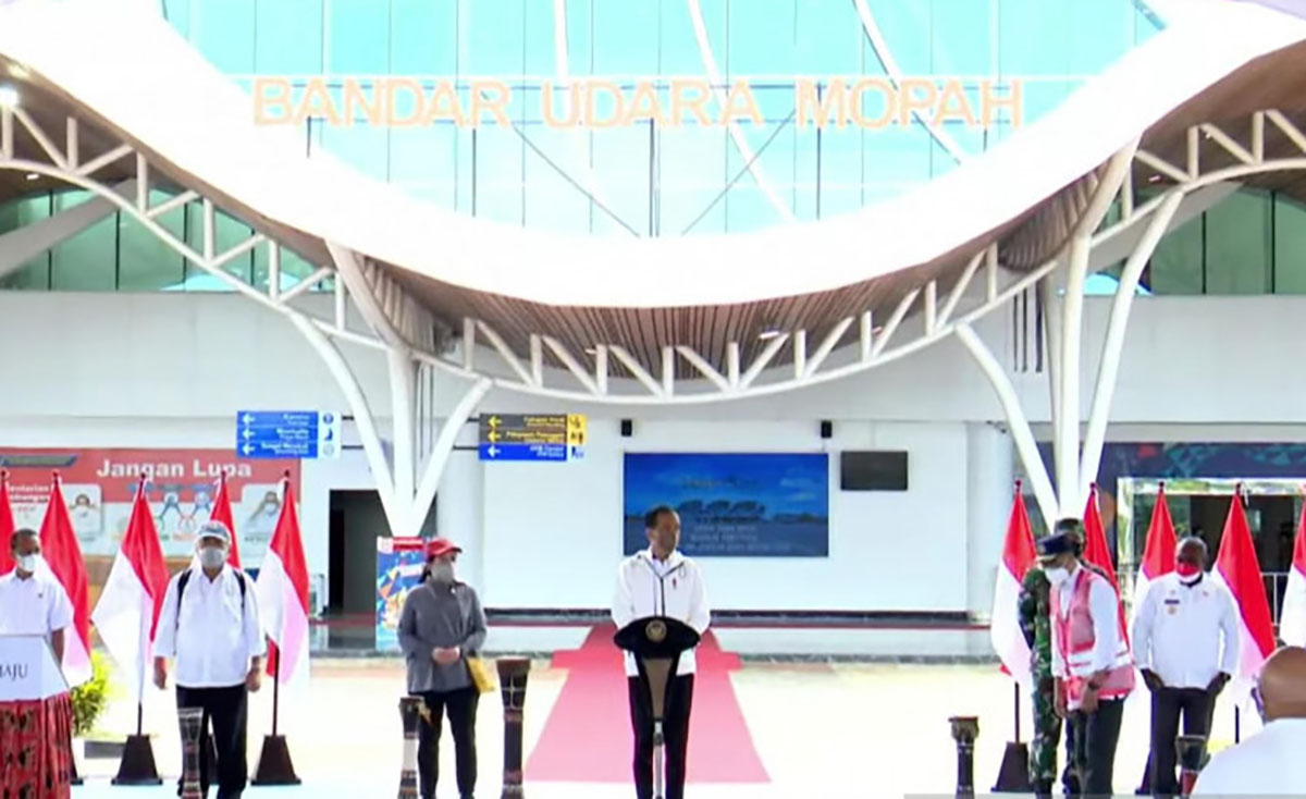 INDOPOSCO.ID – Presiden Joko Widodo meresmikan terminal penumpang seluas 7.200 meter persegi di Bandar Udara Mopah, Merauke, Papua, Minggu (3/10/2021).