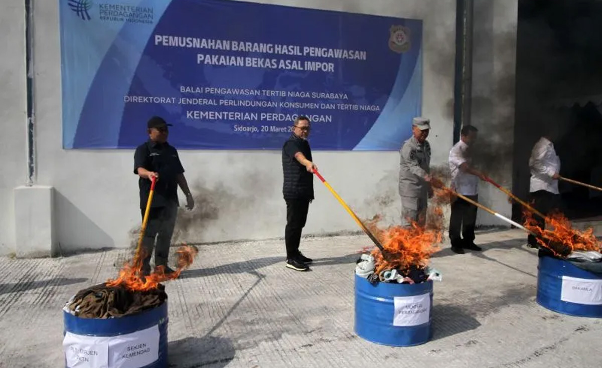 Dia mengatakan barang bekas yang dimusnahkan dengan cara dibakar ini tidak hanya baju, ada juga celana dan jaket yang merupakan hasil temuan program pengawasan Kementerian Perdagangan di wilayah Jawa Timur.