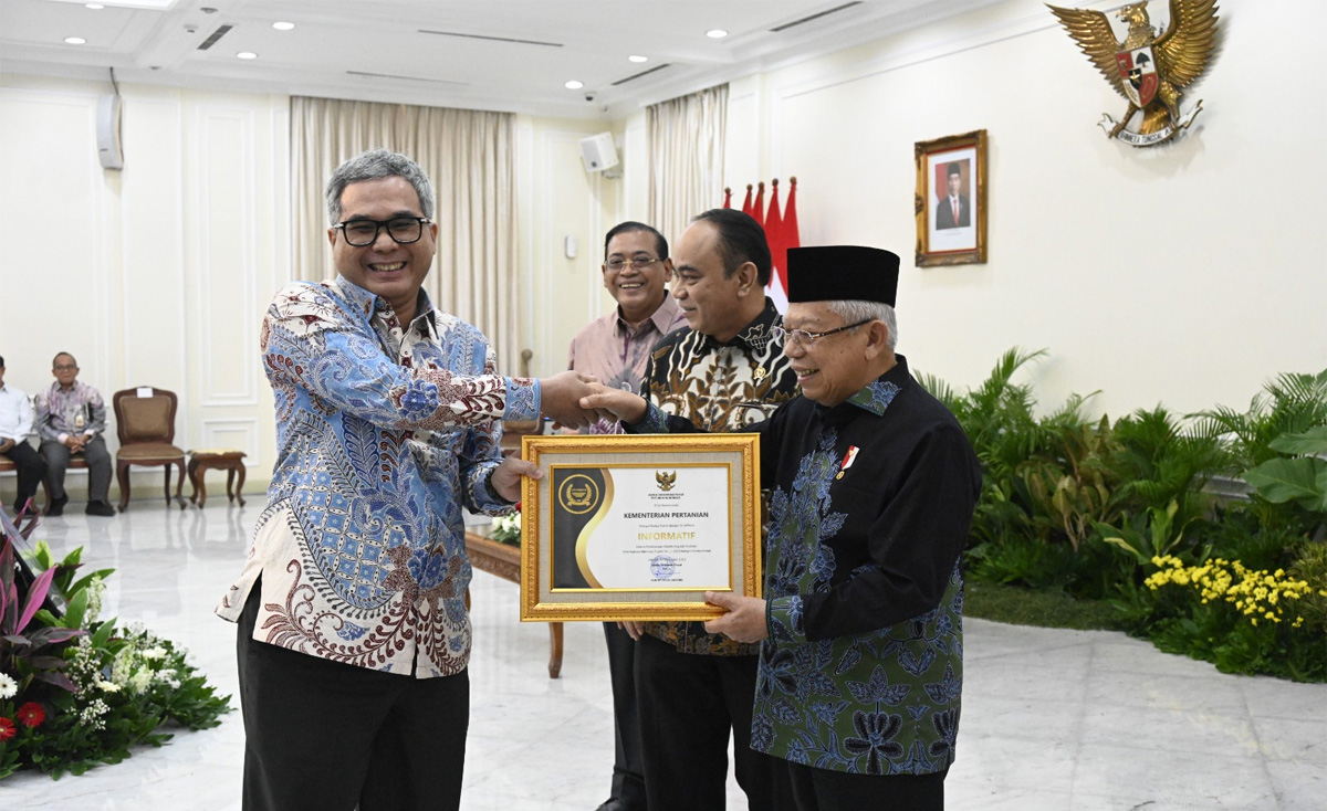 Penghargaan diberikan langsung oleh Wakil Presiden KH. Ma’ruf Amin kepada Wakil Menteri Pertanian, Harvick Hasnul Qolbi.