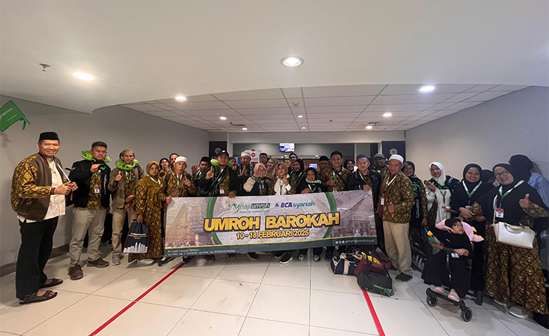 Jemaah Umrah BCA Syariah – Nasabah BCA Syariah berfoto bersama sebelum keberangkatan ibadah umrah (10/2/2025). BCA Syariah memperkenalkan program #Jadimabrur untuk kemudahan dan kenyamanan layanan ibadah umrah dengan travel agent yang amanah.