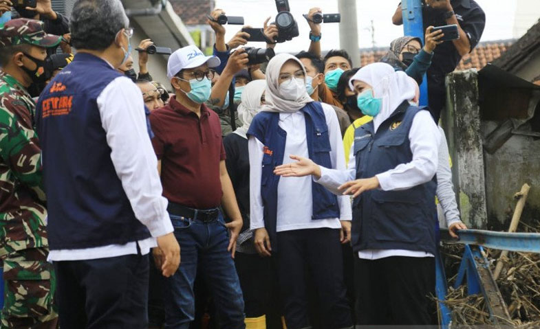 Khofifah mengunjungi lokasi yang terdampak banjir kiriman sekaligus melihat langsung kondisi tanggul Sungai Kedunggaleng yang jebol, sehingga mengakibatkan air meluap ke ribuan rumah warga dan mengunjungi Posko Penanggulangan Bencana Kabupaten Probolinggo di Pendopo Kabupaten Probolinggo, Kamis (11/3/2021) sore.