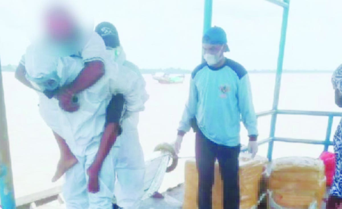 INDOPOSCO.ID – Seorang anggota polisi dari Polres Indragiri Hilir Bripka Dedek Kurniawan, mengendong HM (61), pasien suspek Covid-19 untuk menyeberangi sungai di Indragiri Hilir, Riau. Pasien tersebut dievakuasi karaena mengalami sesak nafas.