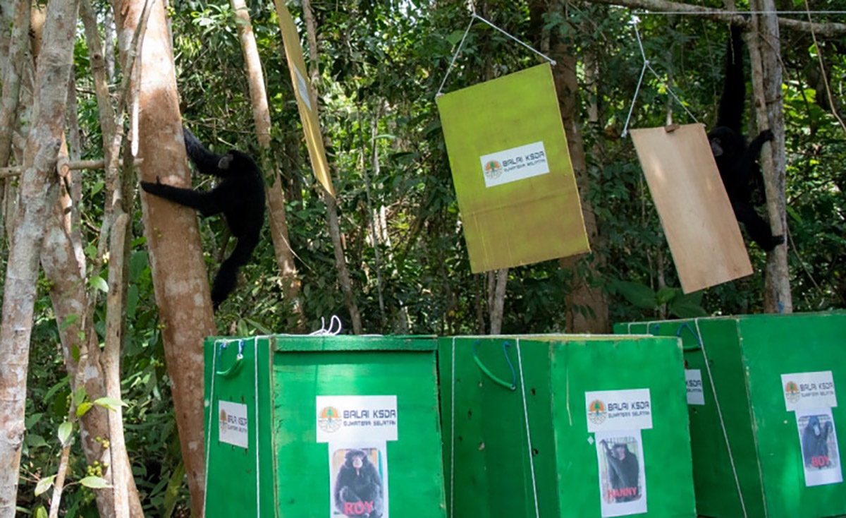 INDOPOSCO.ID – Balai Konservasi Sumber Daya Alam (BKSDA) Sumatera Selatan melepasliarkan tiga ekor owa siamang (Symphalangus syndactylus) di blok perlindungan Suaka Margasatwa, Dangku, Musi Banyuasin, Senin (9/8).