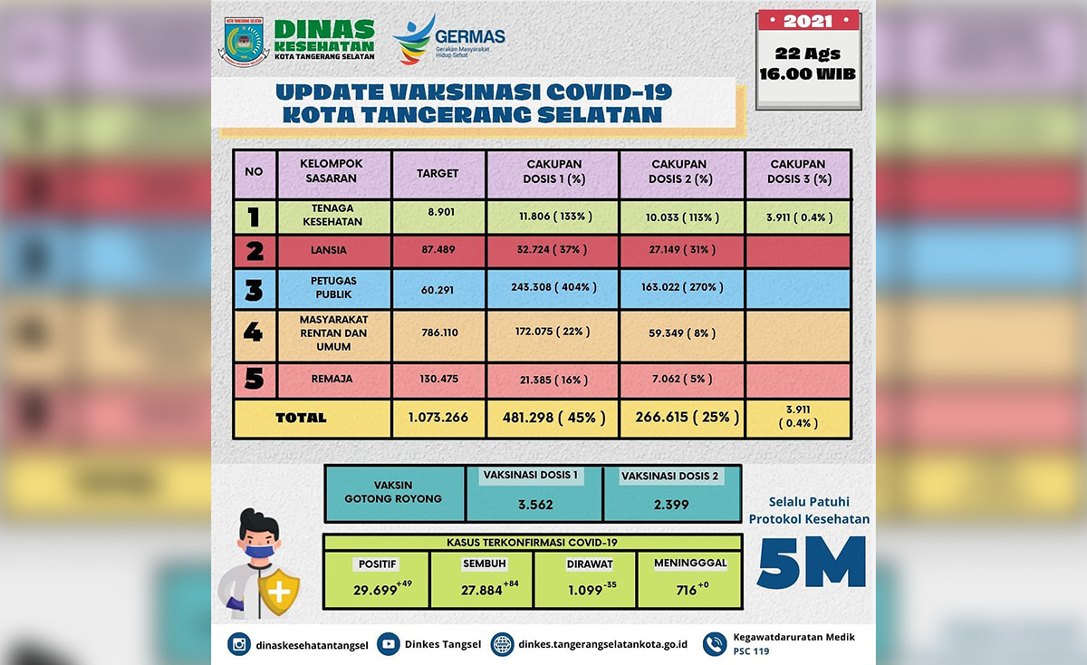 Jadi total target vaksinasi di Kota Tangsel sebanyak 1.073.266 orang. Progres hingga Minggu (22/8/2021), vaksinasi dosis pertama sebanyak 481.298 orang atau 45 persen dan dosis kedua sebanyak 266.615 orang atau 25 persen.