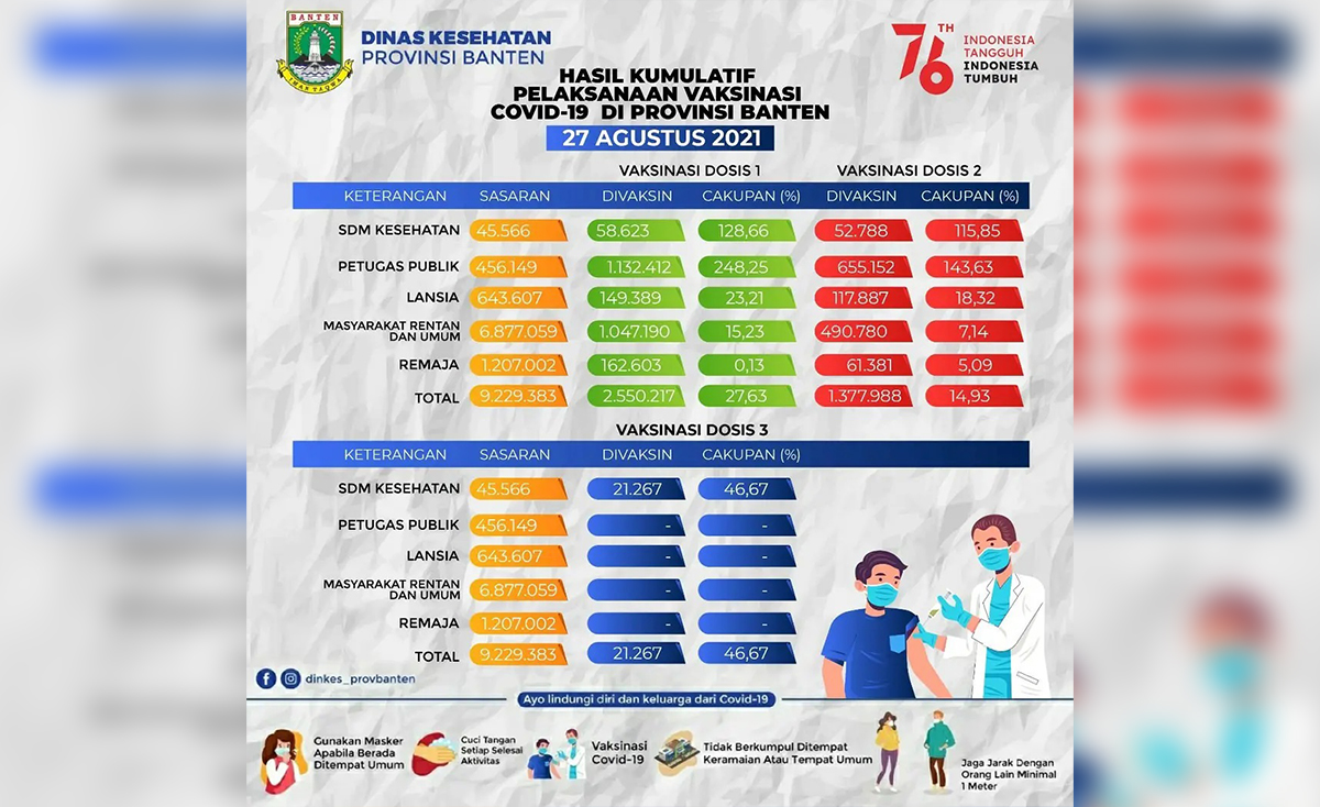 Berdasarkan data terakhir dari Dinas Kesehatan (Dinkes) Provinsi Banten per 27 Agustus 2021, yang diunggah di akun Instagram (IG) @dinkes_provbanten yang dikutip INDOPOSCO, Ahad (29/8/2021), hanya petugas publik dan sumber daya manusia (SDM) kesehatan atau tenaga kesehatan (nakes) yang telah divaksinasi melebihi target. Untuk petugas publik, dosis pertama mencapai 1.132.412 orang atau 248,25 persen dari target atau sasaran sebanyak 456.149 orang. Dosis kedua mencapai 655.152 orang atau 143,63 persen.