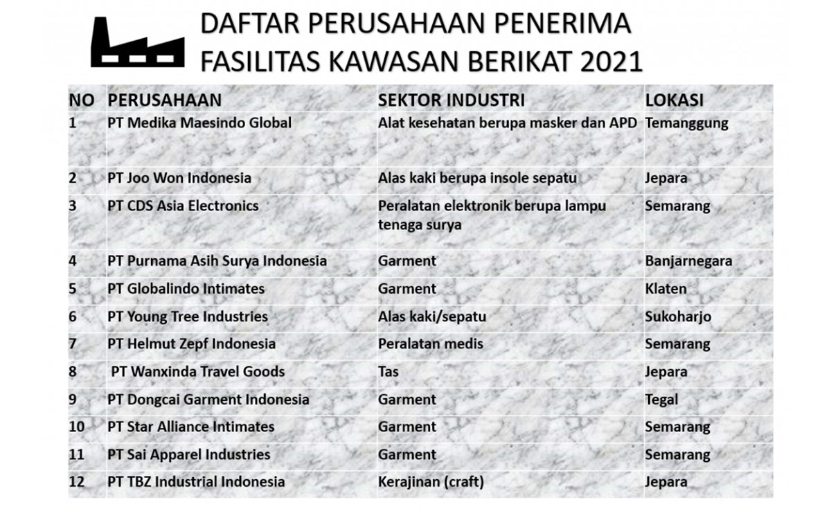 Sejak Januari 2021 hingga saat ini, Bea Cukai Jateng DIY telah memberikan 12 perizinan fasilitas Kawasan Berikat kepada perusahaan yang tersebar di wilayahnya. Perusahaan ke-12 yang memperoleh fasilitas ini adalah PT TBZ Industrial Indonesia, produsen kerajinan (craft) yang berlokasi di Jepara.