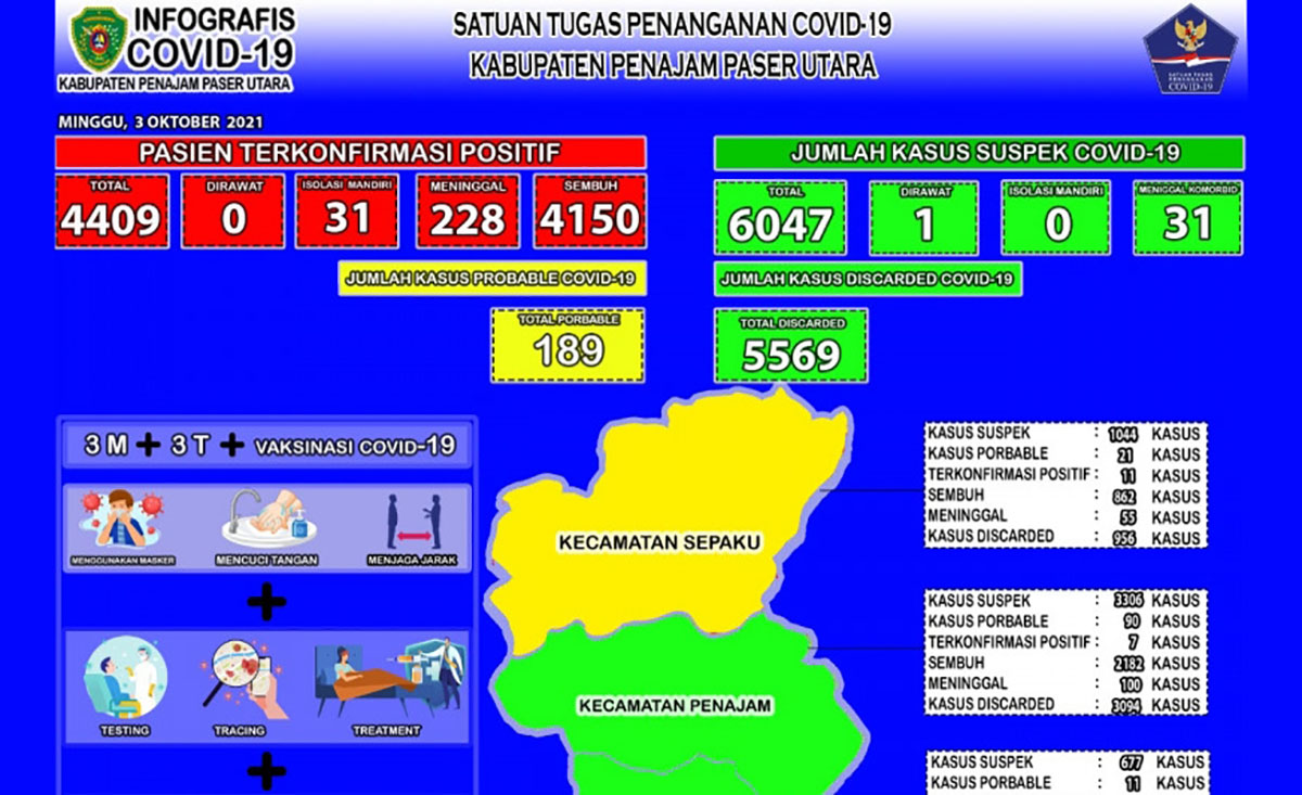 Hari ini terdapat penambahan 1 warga yang terkonfirmasi Covid-19 sehingga total kasus positif menjadi 4.409 orang. Kemudian ada penambahan 9 pasien sembuh, sehingga total sembuh menjadi 4.150 orang.