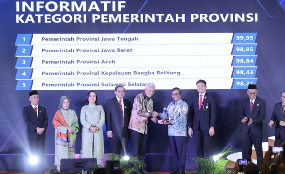 Jawa Tengah mendapat peringkat pertama provinsi keterbukaan informasi publik dengan nilai 99,95, disusul Provinsi Jawa Barat dengan nilai 98,85, dan Provinsi Aceh dengan nilai 98,64.