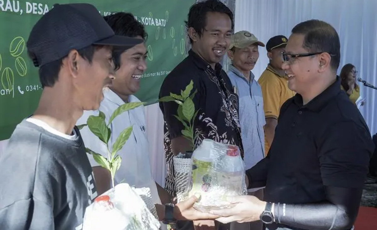 Dalam kesempatan itu, Aries melakukan penanaman kopi bersama kelompok tani yang ada di Dusun Brau, Desa Gunungsari, Kecamatan Bumiaji, Kota Batu. Sebanyak 1.700 bibit kopi jenis arabika dibagikan kepada sepuluh kelompok tani di dusun tersebut.