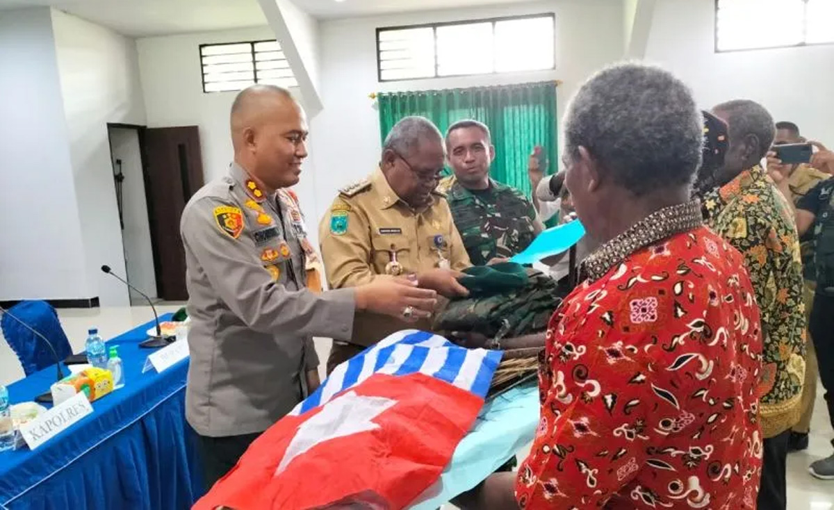 Penyerahan diri pimpinan dan anggota TNPB Sorong Selatan ke dalam pangkuan Ibu Pertiwi disertai dengan penyerahan atribut TNPB seperti bendera Bintang Kejora dan anak panah serta seragam TNPB yang diterima Kapolres Sorsel AKBP Choiruddin Wachid, Bupati Sorsel Samsudin Anggiluli dan Damdim 1807/Sosel Ronald Michael Patty. (aro)