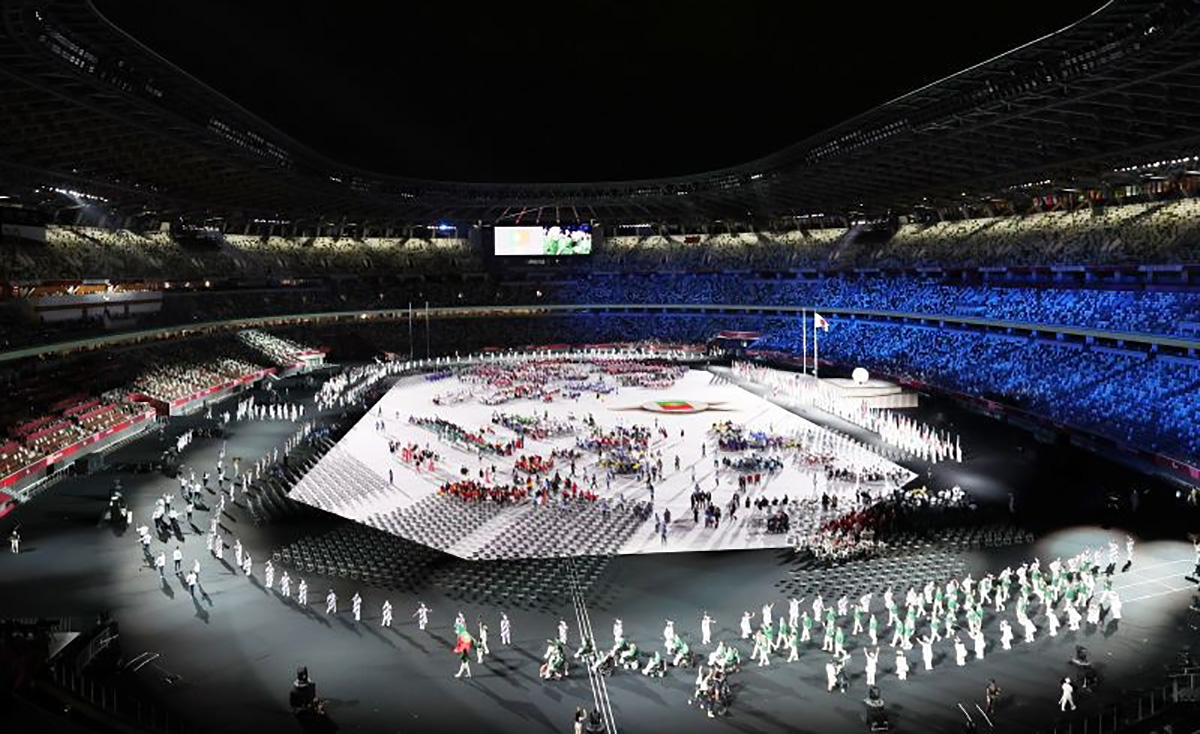 Selanjutnya, bendera Jepang dikibarkan. Setelah itu, penari membentuk logo “Three Agitos” Paralimpiade, yang diiringi dengan nyala kembang api yang memeriahkan langit malam kota Tokyo.